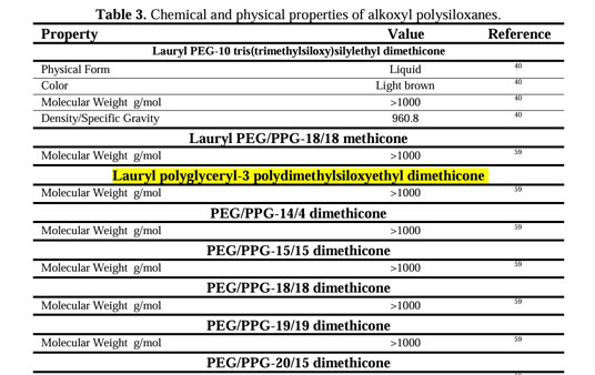 8370 | 月桂基聚甘油-3 聚二甲基硅氧乙基聚二甲基硅氧烷 | LAURYL POLYGLYCERYL-3 POLYDIMETHYLSILOXYETHYL DIMETHICONE | 清潔劑、發(fā)用調(diào)理劑等 | 2024-04-30《國(guó)際化妝品安全評(píng)估數(shù)據(jù)索引》有,CIR文獻(xiàn)只提到屬于高分子聚合物如左上圖示,未提供安全用量,對(duì)應(yīng)餅圖粉色區(qū)域 數(shù)據(jù)類型7,原料供應(yīng)商出具文件,包括: 1. 平均相對(duì)分子質(zhì)量>1000道爾頓(Dalton, Da) 2. 相對(duì)分子質(zhì)量<1000Da的低聚體含量少于10%(若小分子量低聚體超出限量,要考慮透皮吸收,且不滿足該類型適用范圍) 3. 局部毒性毒理學(xué)終點(diǎn),若采用或引用非《技術(shù)規(guī)范》毒理學(xué)試驗(yàn),應(yīng)與《技術(shù)規(guī)范》方法在試驗(yàn)設(shè)計(jì)要點(diǎn)方面進(jìn)行比較 4. 不具備生物活性的說明 |